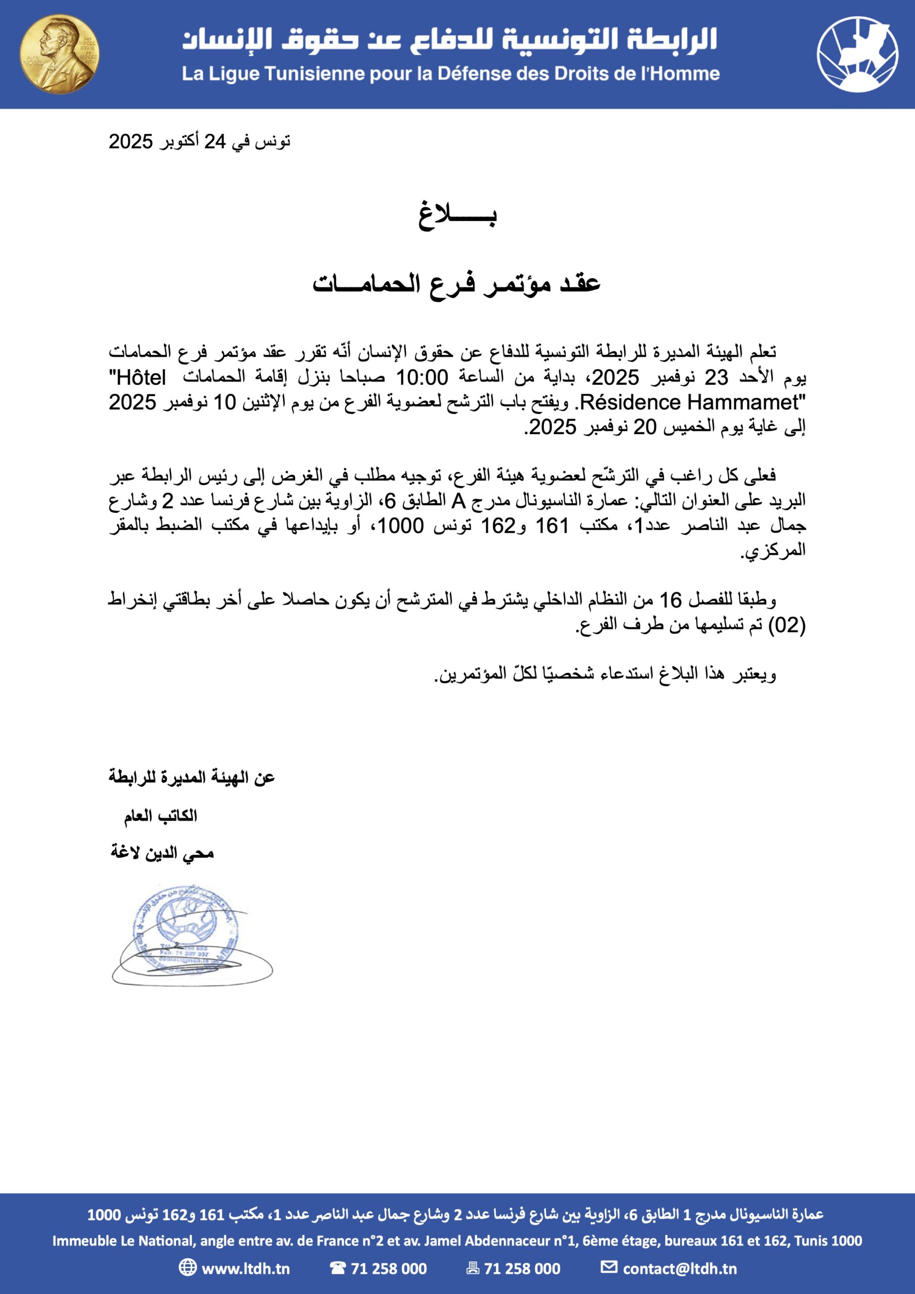 تعلم الهيئة المديرة للرابطة التونسية للدفاع عن حقوق الإنسان أنّه تقرر عقد مؤتمر فرع الحمامات يوم الأحد 23 نوفمبر 2025، بداية من الساعة 10:00 صباحا بنزل إقامة الحمامات “Hôtel Résidence Hammamet”. ويفتح باب الترشح لعضوية الفرع من يوم الإثنين 10 نوفمبر 2025 إلى غاية يوم الخميس 20 نوفمبر 2025.